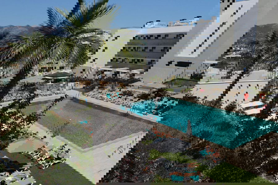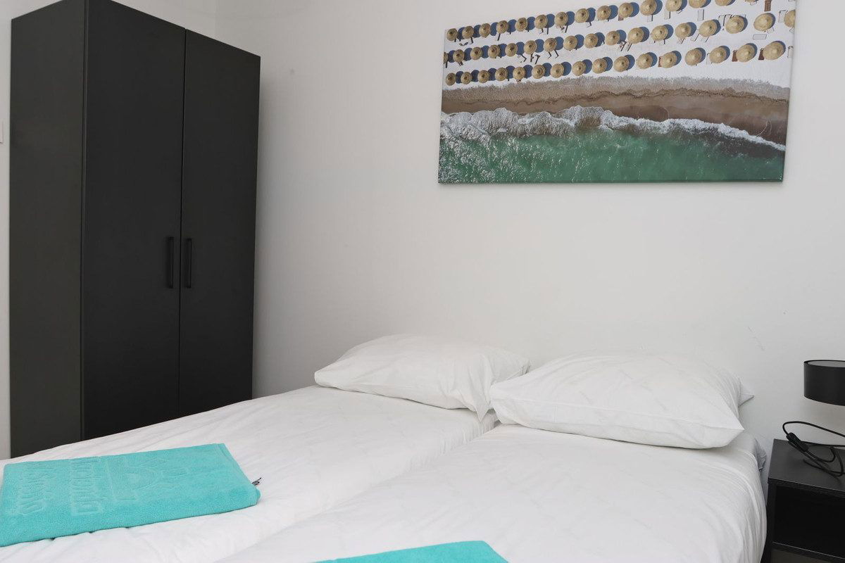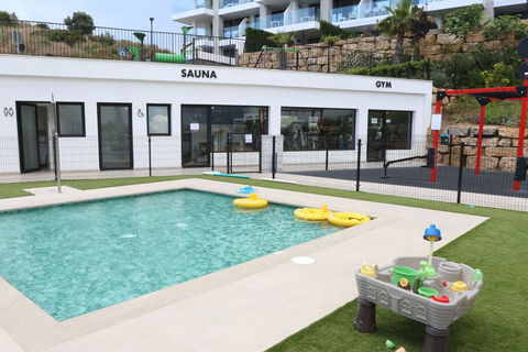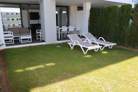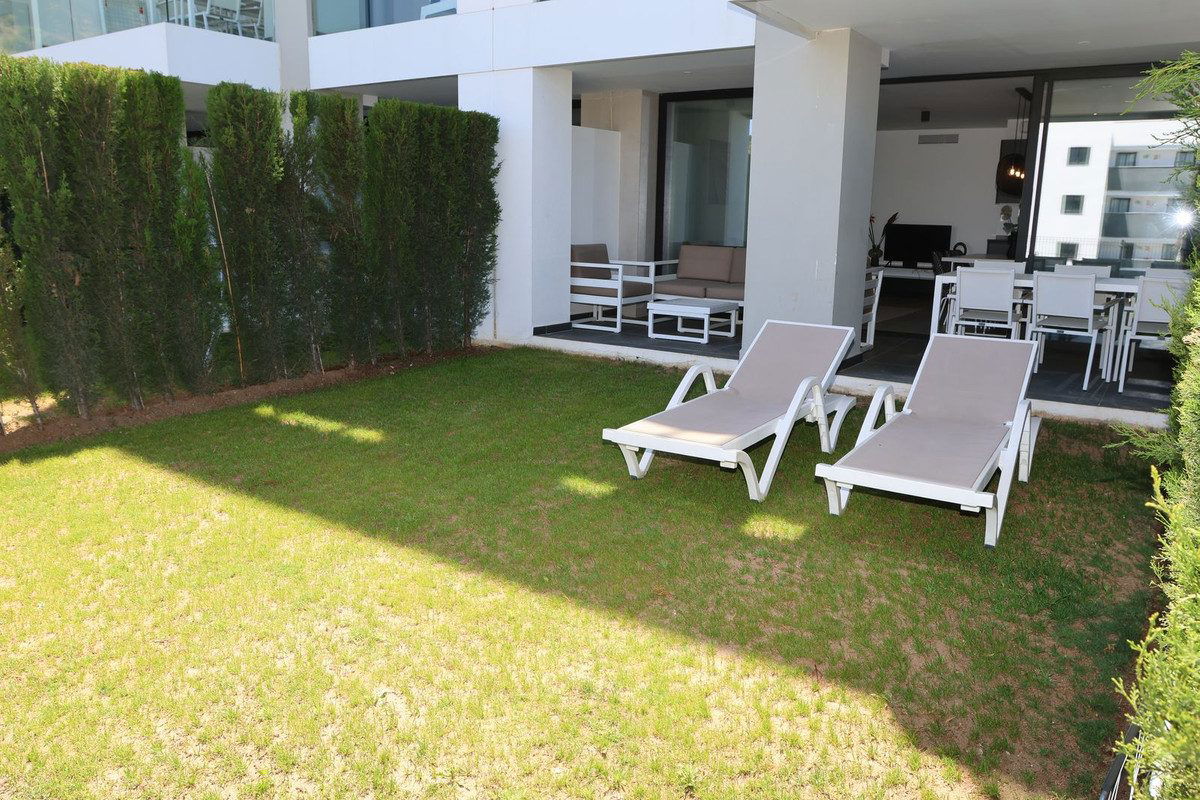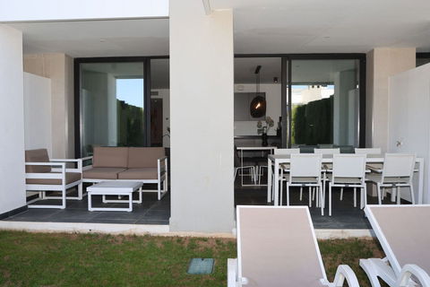 Competitively priced! Enjoy your coming holidays in this contemporary ground floor apartment with a large private garden. Entering the apartment you have three bedrooms on the left of the hallway which leads you to the spacious living room with open plan kitchen, all beautifully decorated with furniture from the Netherlands. The wall to floor sliding terrace doors open up to a covered terrace and private garden. Complete with an underground parking spot and a very practical, spacious storage room at the entrance of the apartment. What makes this urbanization special is: heated pool, sauna, gym, laudry area, restaurant open all year, mini supermarket and concierge. Last but not least you can also enjoy the hotel style rental services offered on site.