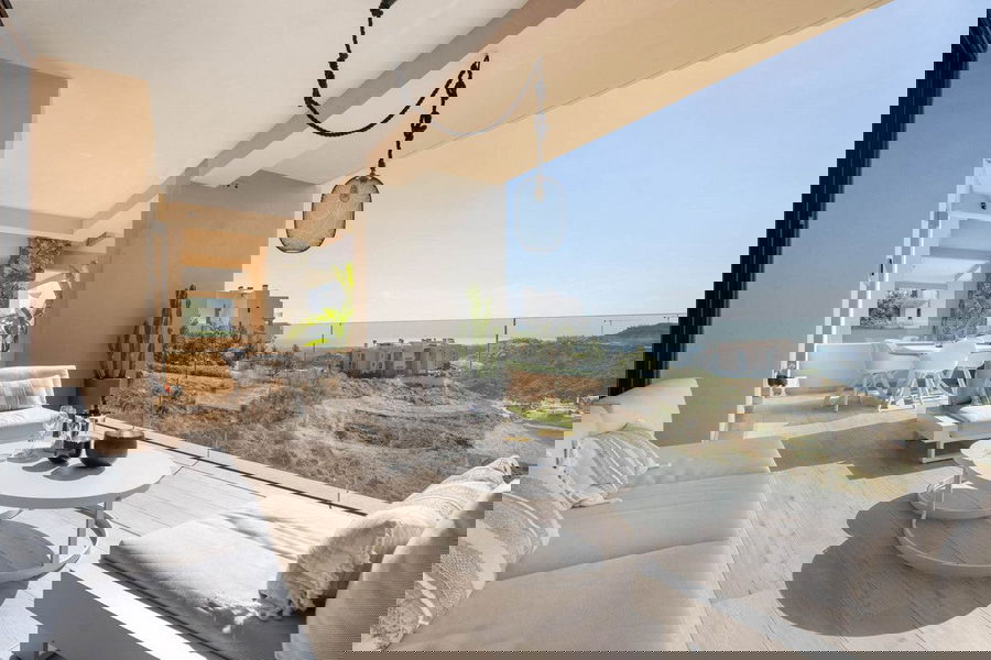 The open-plan layout connects the kitchen, dining, and living areas, creating a fluid interior space that extends onto a spacious southwest-facing terrace. From here, panoramic sea and mountain views provide an inspiring backdrop, with sunlight throughout the day and striking sunsets in the evening.