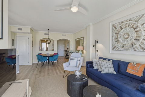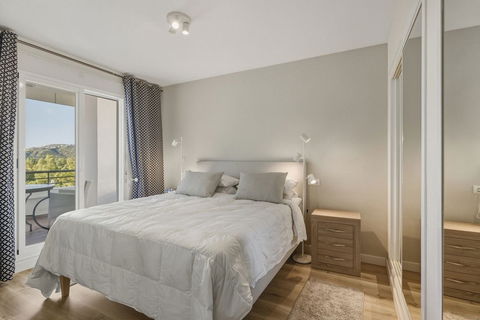 The apartment is presented in excellent condition, with a smart layout that maximises both light and space. The bright open-plan living and dining area flows seamlessly onto a generous 30 m² private terrace, creating an ideal space for relaxing, entertaining or simply enjoying the peaceful golf and garden views. Warm wood flooring and quality finishes add a sense of contemporary elegance, while double glazing and hot and cold air conditioning ensure year-round comfort. The fully fitted kitchen is both stylish and practical, offering ample storage and worktop space as well as a separate utility room.