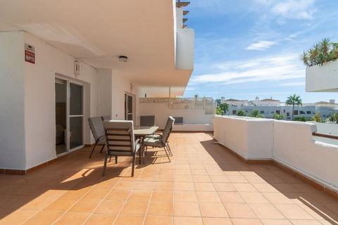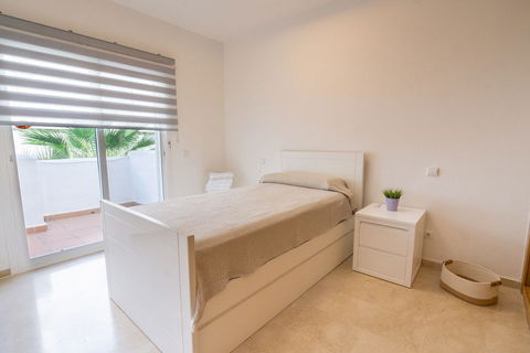 The apartment is spacious and well distributed. From the entrance hall you access a bright open-plan living and dining area that leads directly onto a large southeast-facing terrace. This outdoor space, partly covered and partly open, is ideal for enjoying the sun throughout the day with pleasant views of the garden, the pool and the green areas of the community. The kitchen is independent, of good size, and also has a practical utility area.