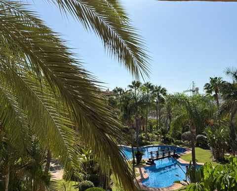 The master bedroom includes a cozy walk-in closet, and from both the bedroom and the living room you can access a spacious terrace offering unbeatable views of the stunning gardens and pool. The property also includes a private outdoor parking space within the community.