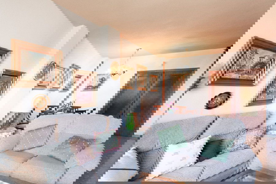 Upon entering, you are welcomed by a large living-dining room bathed in natural light, with large windows that open onto a cozy private terrace—ideal for enjoying the Mediterranean climate. The fireplace adds a warm and elegant touch, perfect for creating a cozy atmosphere during the cooler months.