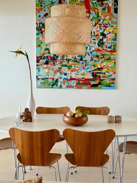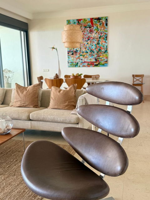 The interior design is tasteful and timeless, featuring classic Danish designer furniture that enhances the apartment's exclusive and inviting atmosphere.