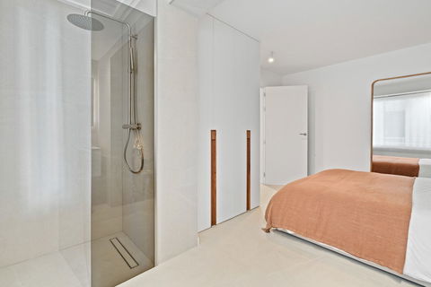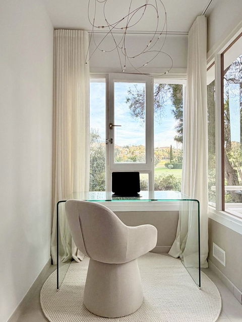 This renovated apartment is located in Alcores del Golf, a south-facing property with plenty of natural light and a clean, minimalistic design. The open-plan layout connects the living area with a modern kitchen, and the large terrace features a barbecue, dining area, and a relaxing outdoor space with views of the garden and greenery.
