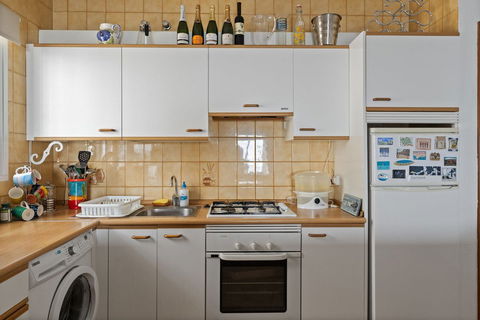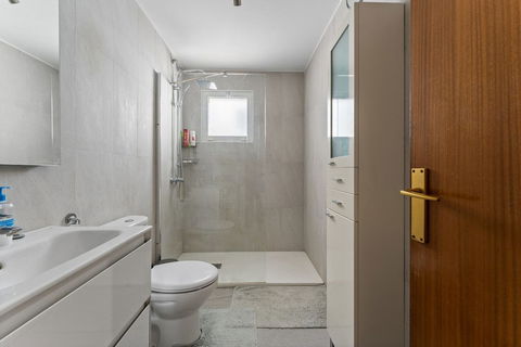 Suddenly the corridor opens up and the sea appears. The kitchen, dining and sitting areas flow as one light-filled space, so the cook can chat with guests without losing sight of the blue horizon beyond the patio doors. Stone-effect worktops, full-height cabinets and a breakfast bar keep the kitchen smart and practical, while split-unit air-conditioning, a ceiling fan and a modern pellet stove ensure year-round comfort. Fibre broadband and a satellite-ready TV point are already in place.