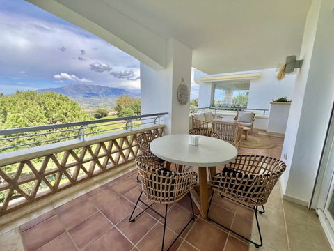This well-appointed 1st floor apartment is located in the heart of La Cala Golf, Resort and boasts superb views to the sea and the mountain of Mijas. The property with 2 bedrooms and 2 bathrooms is generous in quality and size with entrance hall, fully fitted kitchen with adjacent laundry, large living – dining room open onto a great covered terrace with panoramic views. Spacious master suite with its large bedroom open to the terrace, dressing-room and beautiful marble bathroom with large walk-in shower. The second bedroom, has access to the its terrace and private use little garden with afternoon sun. The complex is gated, really beautiful and give a real feel of exclusivity, with spectacular garden and superb swimming-pool with truly impressive views. The property includes an underground private parking space.Set within a very exclusive gated community boasting impeccably maintained communal areas, including a generous swimming pool, lush manicured gardens and stylish water features.