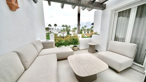The apartment is located in the prestigious Costalita urbanization — one of the most sought-after beachfront complexes in Estepona. It features beautifully maintained tropical gardens, a swimming pool, direct access to the beach and promenade, and all amenities nearby: restaurants, shops, golf courses, and a school in Cancelada. Only 10 minutes to Puerto Banús and about 12 minutes to Estepona town center.