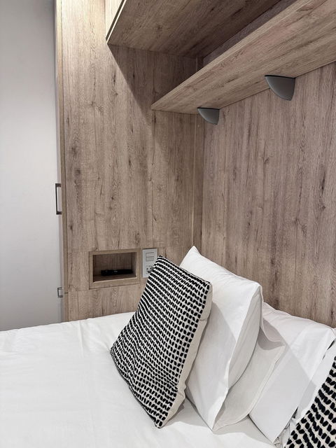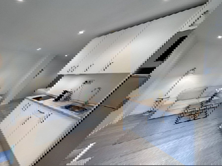 Cozy property with an elegant contemporary style, consisting of a living room with kitchen, bedroom area, and bathroom.