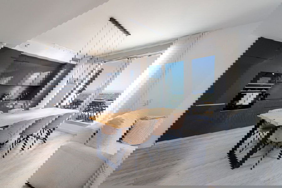 The heart of the home is an open-plan living area featuring a sleek black high-gloss kitchen with Siemens appliances, a spacious dining area, and a cozy lounge that spills out onto a sun-kissed terrace — ideal for alfresco dining and sunset cocktails.
