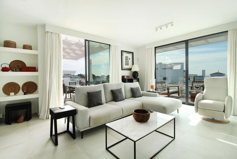 Set in a peaceful yet convenient location, just a nine-minute stroll from a choice of restaurants, bars and supermarkets, this exceptional three-bedroom south-facing penthouse enjoys sweeping Mediterranean views from almost every room and from its expansive terraces.