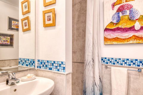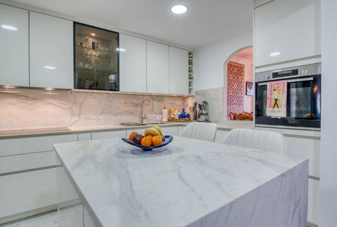 The apartment features a generous open-plan living and dining area, filled with natural light and opening directly onto a 14 m² terrace, perfect for alfresco dining while enjoying the sea views. From the living space, stairs lead to a remarkable 120 m² private roof terrace, providing panoramic coastal vistas and ample space for entertaining, sunbathing or creating multiple outdoor lounge areas.