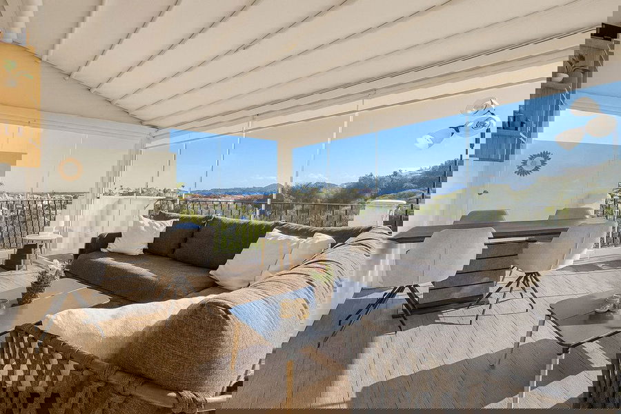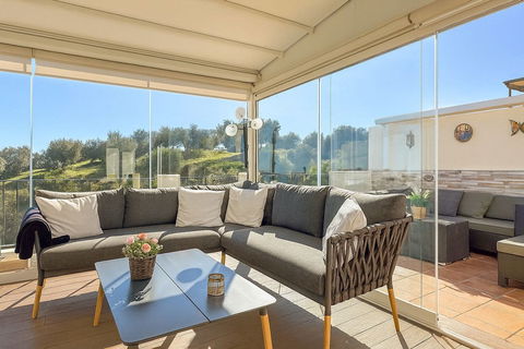 The highlight of this property is its upper floor. The current owners have transformed a part of the roof terrace into an enclosed glass pergola that can be opened with sliding doors, creating a second, very cozy living or lounge area with spectacular, year-round views.