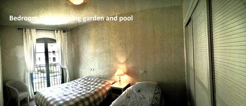 The main bedroom opens out onto the lower terrace looking over the golf course while the other 2 rooms open with balconies to the phase 2 swimming pool.