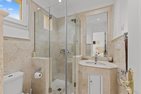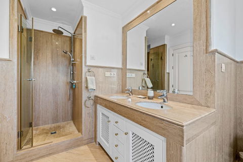 The property has three double ensuite bedrooms, including the master suite with a large private bathroom featuring a corner jacuzzi bath, walk-in shower, and double basins. Each bedroom has direct access to the extensive terrace. There is also a separate guest toilet. Air-conditioning is installed throughout, with underfloor heating in the bathrooms.