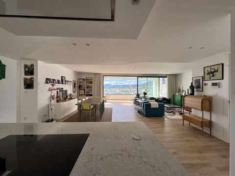 The living room with designated dining and lounge area is very wide and gives access to the covered terrace with open views to the sea and mountains.
