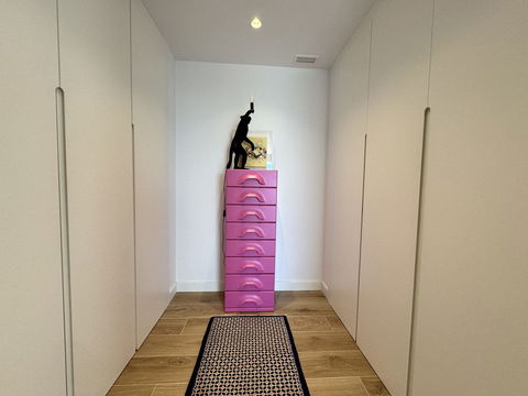 Under the staircase leading to the solarium is a handy storage room.