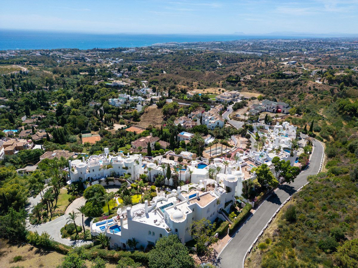 The community of Jardines Colgantes, also known as Marbella Hill Club, is celebrated for its exclusivity, privacy, and low-density development. Wide, tree-lined streets and meticulously landscaped gardens create a tranquil atmosphere, while the elevated location ensures residents enjoy both security and breathtaking views. Properties in the area range from traditional Andalusian-style villas to contemporary residences, creating an elegant yet diverse architectural landscape.