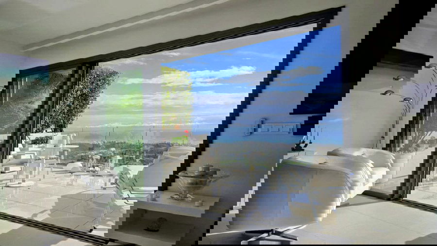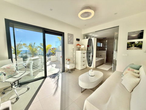 The particularly bright, double aspect living accommodation impresses with it's modern open plan spaces. When sitting on the sofa, views can be enjoyed of both the Med to the front & the countryside and mountains to the rear.