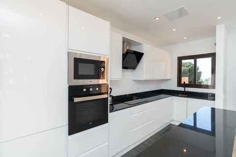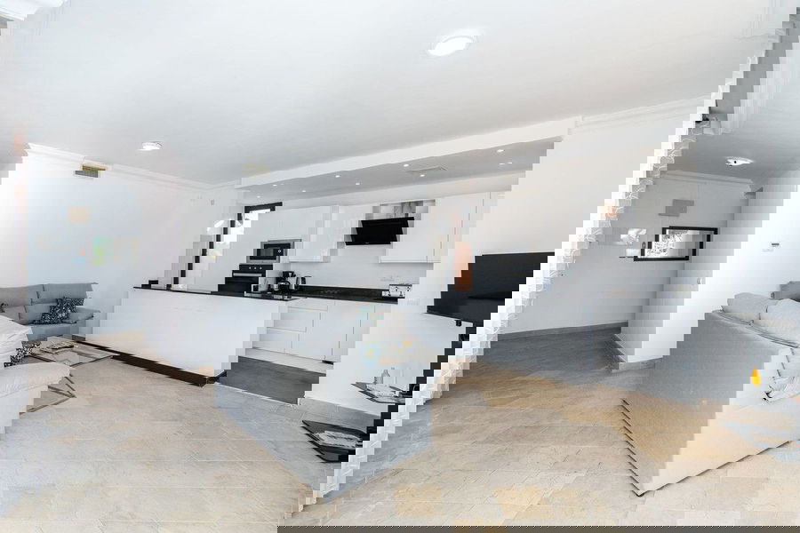 The apartment features a bright and airy open-plan living and dining area, two generously sized bedrooms with fitted wardrobes and air conditioning throughout, and not just one but three private terraces—including a stunning large rooftop solarium, perfect for sunbathing, entertaining, or enjoying beautiful views of the Mediterranean climate.