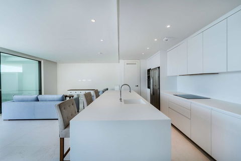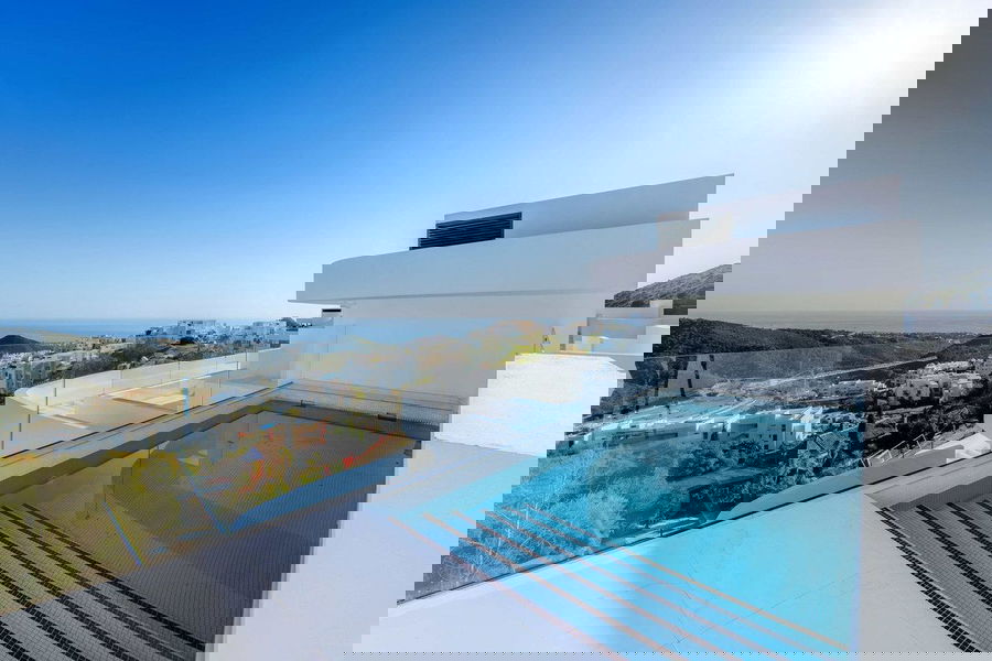 Designed for those who appreciate seamless indoor-outdoor living, the open-plan kitchen flows effortlessly into the spacious living area, extending onto an expansive terrace that invites you to soak in the uninterrupted sea views. Natural light floods the space, enhancing the bright, airy ambiance while ensuring total privacy.