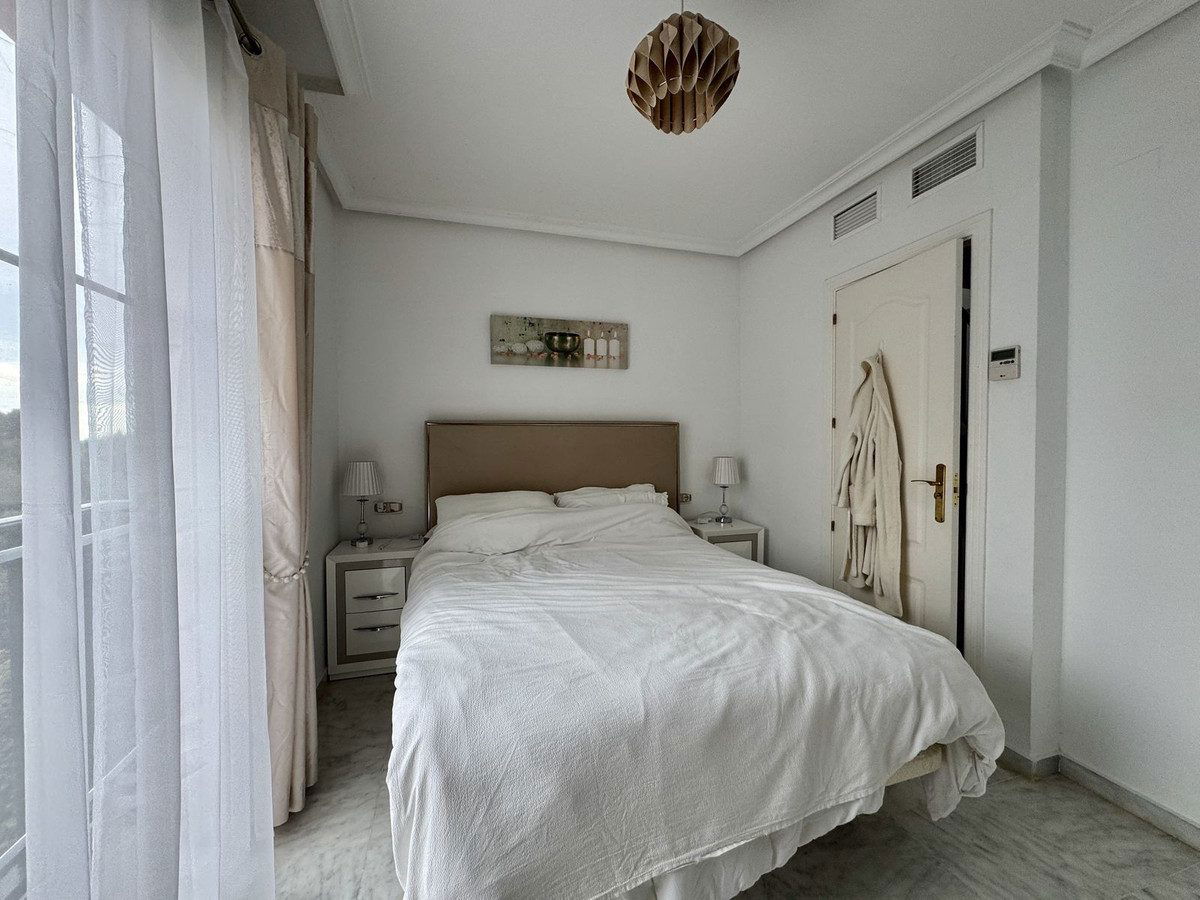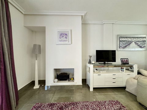 This attractive three bedroom house is located in a frontline golf position while still being walking distance to the beach. The house has three real bedrooms on the upper level and two bathrooms plus a guest toilet. Many owner have even added an extra bedroom and bathroom in the basement/garage while this owner has choosen to keep the garage and storage space. The owner has improved the property with an amazing modern kitchen false ceilings with spot lights giving the property a modern feel. With two nice terraces on the lower level and also a roof terrace one has plenty of outdoor space to really allow one to enjoy the Spanish climate. The complex is gated with two swimming pools.