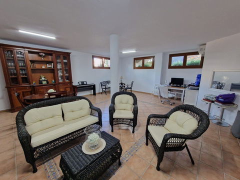 It consists of 5 bedrooms, 6 bathrooms, a spacious living room, a large modern fitted and equipped kitchen, a wine cellar, a small gym, a storage area, a games room, a closed garage for 2 vehicles, a large porch, a large terrace on the upper floor, a private garden, and a private pool.