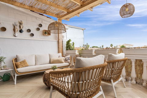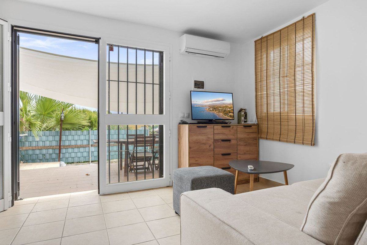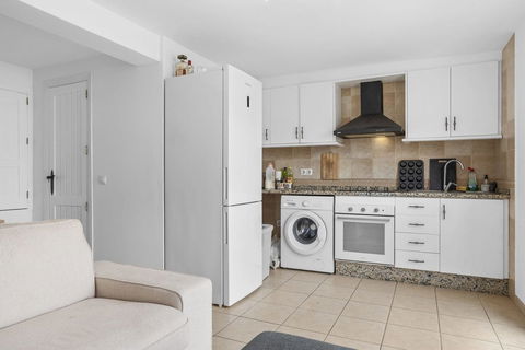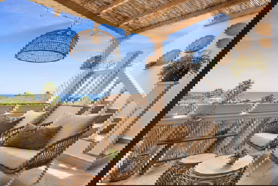 It has a very cozy, spacious living room with an open kitchen that is equipped with all the necessary appliances. From the living room, you can directly access the terrace. Both the kitchen, living room, and terrace offer stunning sea views.