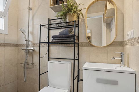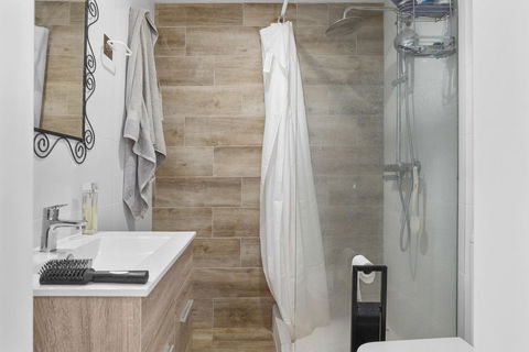 All the way down, there is a separate apartment. It has its own entrance and its own outdoor space, making it a separate residence. The apartment has a living room with an open kitchen, a bedroom, and a bathroom. This apartment was also completely renovated last year.