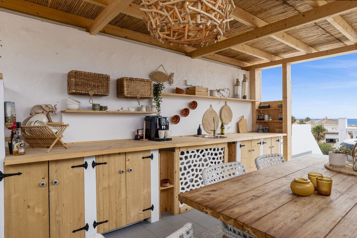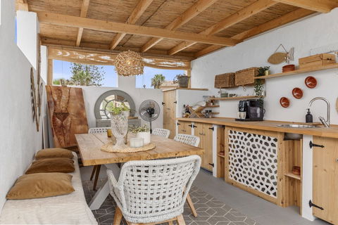 If you go up from the terrace via an outdoor staircase, there is a sensational outdoor kitchen created, a very cozy space where you can privately enjoy the beautiful sea view with friends. This charming outdoor kitchen is equipped with all conveniences; built-in appliances such as a dishwasher and refrigerator, a nice dining table for 6 people, a fully equipped bar cabinet with plates and glasses, in short, everything you need for a lovely summer evening.