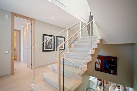 Spread across four luxurious levels and connected by a private elevator, the home exudes both comfort and convenience. The sleek Siematic kitchen comes fully equipped with premium appliances, while underfloor heating ensures year-round comfort and energy efficiency. Integrated Bang & Olufsen speakers and TVs elevate the living experience with timeless elegance and superior sound.