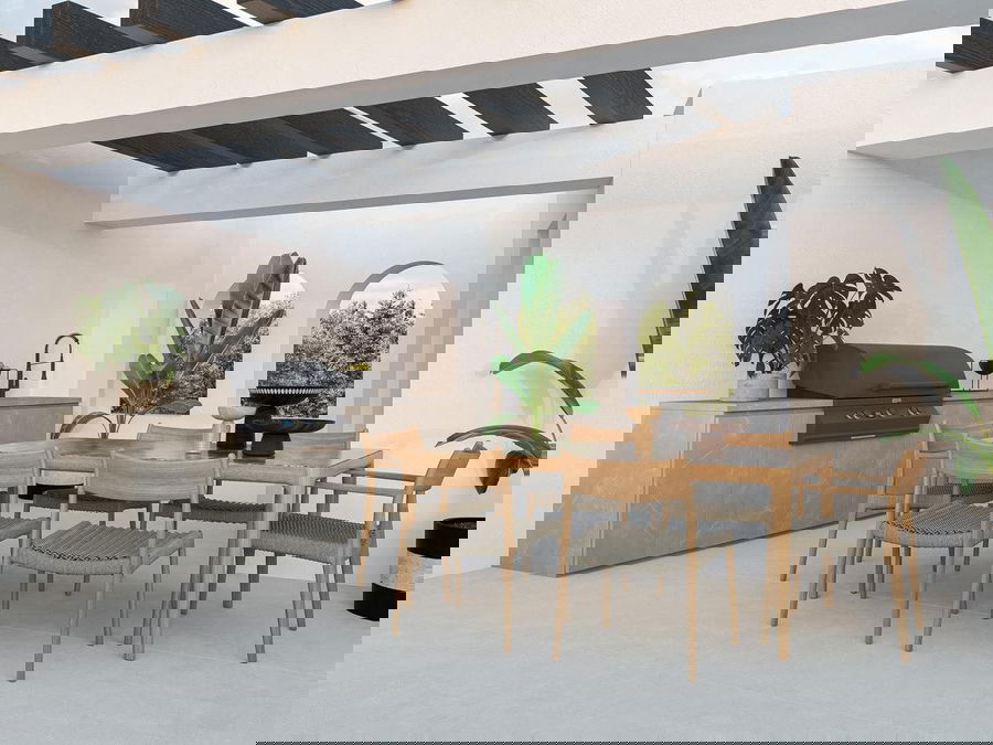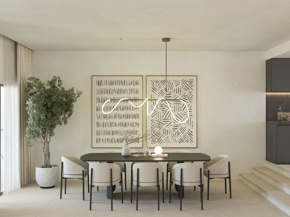 A property with a vast square meterage of 332 m2 (200m2 internal / 132 terraces), the ground floor enjoys ample space. The front entrance court yard is private and with golf and bike storage for up to four bikes. Moving into the house an incredible open plan kitchen living dining area which leads out onto covered and open terrace area with garden that overlooks the golf course.