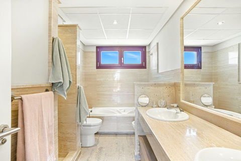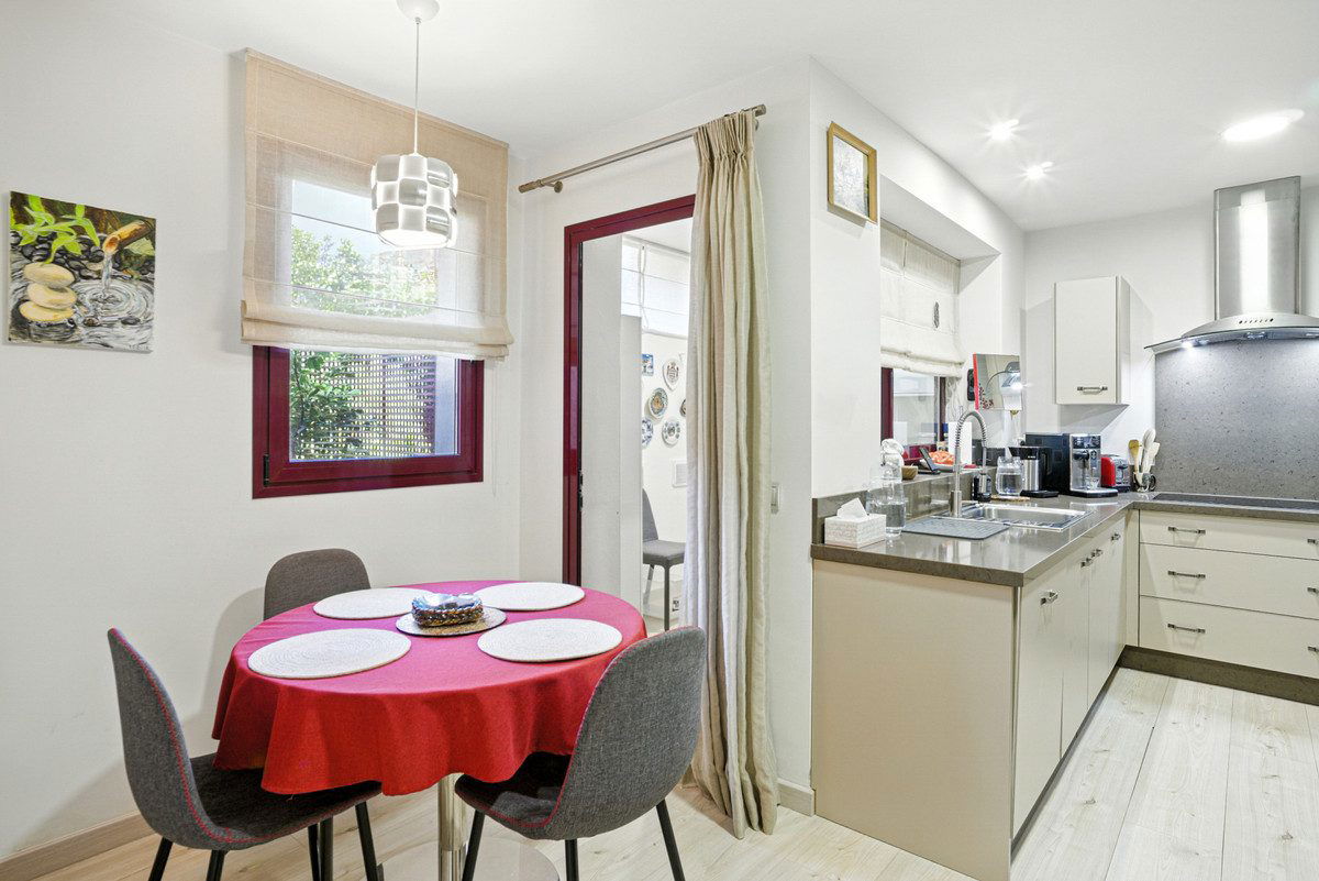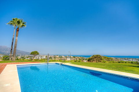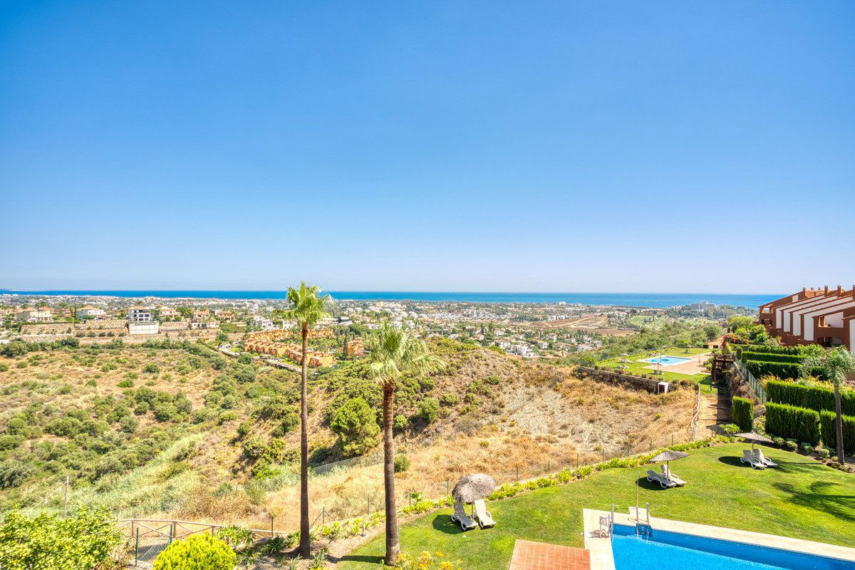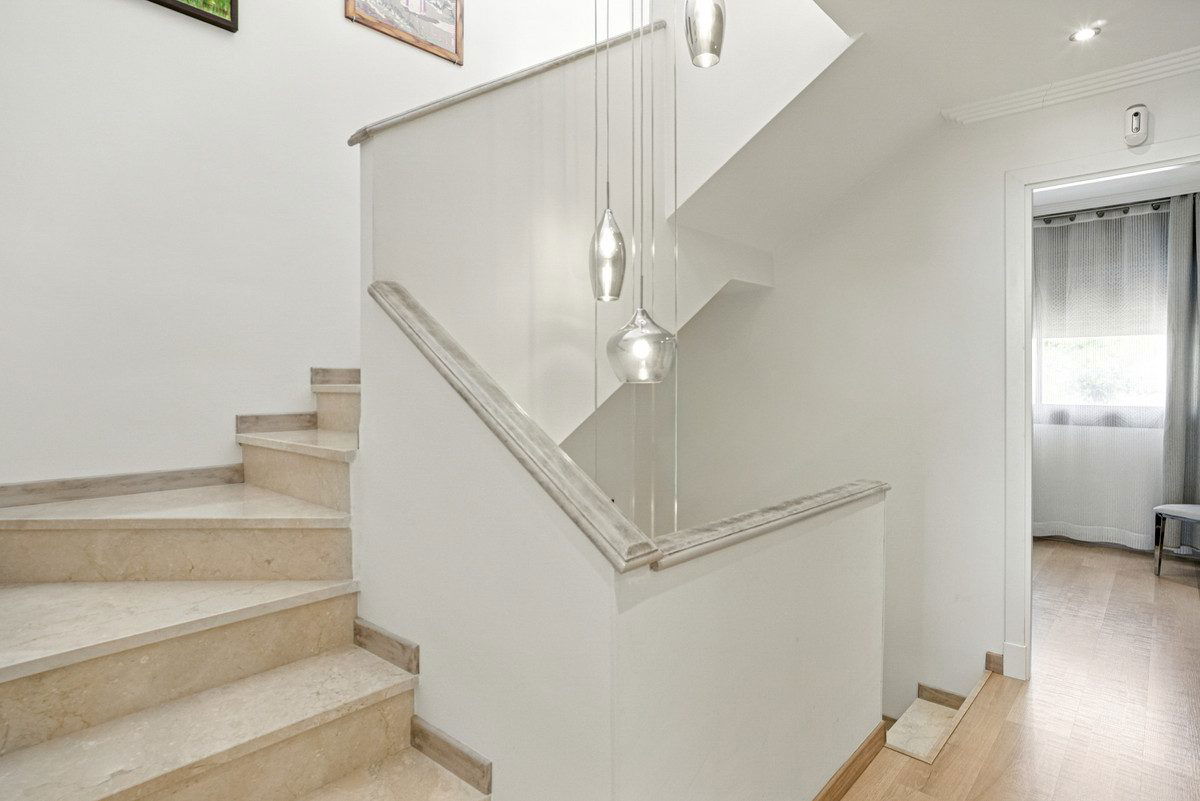 Beautiful semi-detached house in the prestigious community of Los Jaralillos, located in the sought after area of El Paraíso, Benahavís. Located near golf courses, this property offers an ideal combination of comfort, privacy and excellent location. This charming semi-detached house features a private garden and offers stunning sea views from several terraces. The main floor has a fully equipped kitchen, large living room, utility room, guest toilet and a large terrace with sea views, which offers direct access to the private garden, creating a perfect space to enjoy outdoors. On the upper floor are three rooms, one of them studio type, ideal as office, work room or additional bedroom. Two of the bedrooms have access to a terrace overlooking the sea. The master bedroom is en suite, and this floor also has an additional bathroom and a small living room.The solarium floor offers a generous terrace, perfect for sunbathing or enjoying panoramic views. The basement houses the machine room and a multipurpose room, as well as direct access to the parking lot, which provides great comfort. The property is located within a gated community, with very well maintained gardens and three communal swimming pools. Additional features include wooden floors, air conditioning, parking space and solar panels, providing energy efficiency and sustainability. This townhouse perfectly combines comfort, privacy and a privileged location, ideal both as usual residence and holiday home.