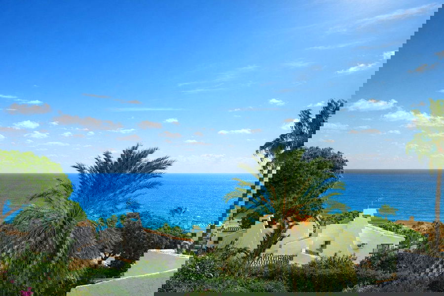 The upper floor features two bedrooms and a full bathroom. From this level there is access to an additional private garden of approximately 70 m², carefully maintained and surrounded by abundant vegetation that provides shade, freshness, and a pleasant sense of privacy, well-being, and peace. From here, there is also access to a second south-facing terrace with views over the garden and the sea, further enhancing the strong connection with the natural surroundings.