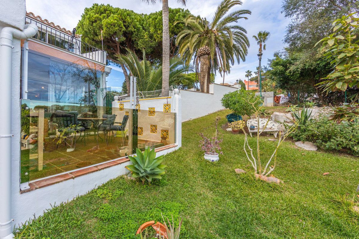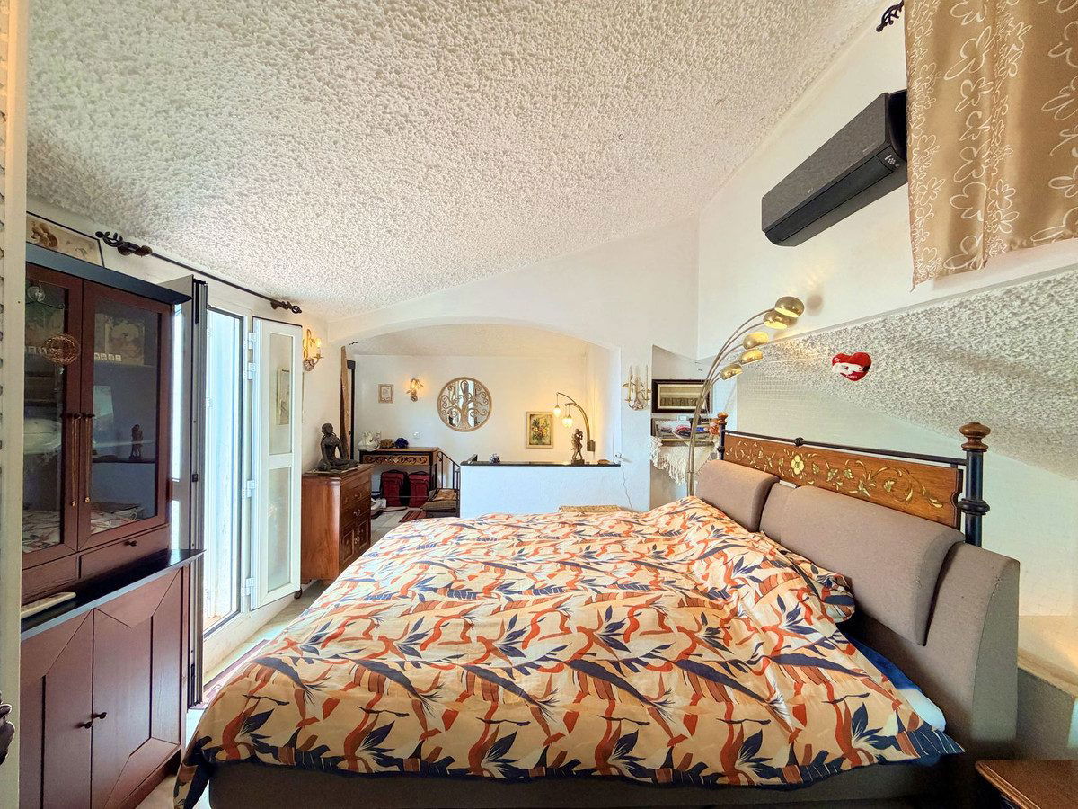 The property is arranged over two levels and welcomes you with a cozy front patio that immediately reveals the special character of the home. On the main floor there is a bright living room with fireplace, a separate kitchen, and a pleasant east-facing terrace that opens onto a beautiful private garden with a chill-out area and barbecue. From here, one can enjoy relaxing views of the Mediterranean Sea and, on clear days, the African coastline, creating an ideal space to unwind, socialize outdoors, and make the most of the Costa del Sol's exceptional climate. The house is equipped with Somfy awnings, sliding Lumon glass curtains, hot and cold air conditioning, and solar panels, providing comfort and energy efficiency.