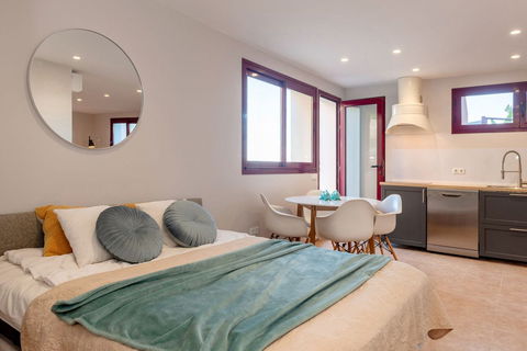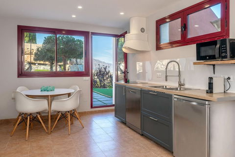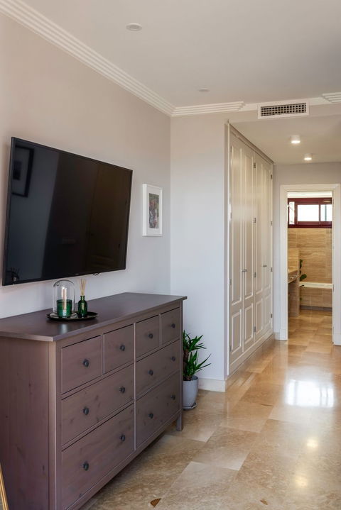 On the entrance level there is a spacious, living room with fireplace, open plan kitchen and dining area, guest toilet and a large terrace with spectacular sea and La Concha mountain views. The living room is very well lit, with panoramic terrace windows and an additional window at the dining table.