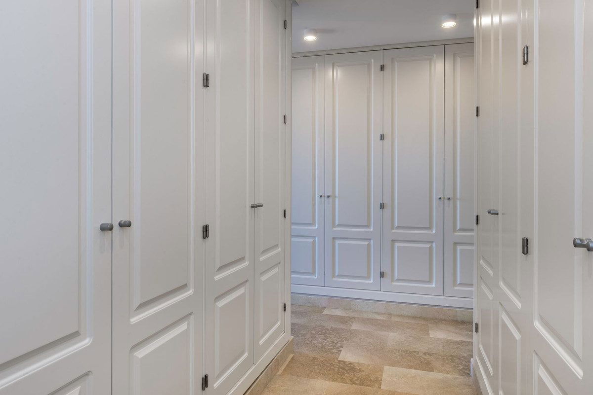 On the first floor there is a master bedroom with ensuite bathroom and large dressing room, two bedrooms with a shared bathroom and a spacious terrace with panoramic sea and mountain views. Each bathroom is equipped with a shower and a bathtub. Two bedrooms have built-in wardrobes with plenty room of storage space.
