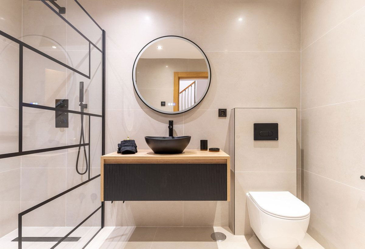 Each of the four bedrooms comes with stylish fitted wardrobes, custom lighting, and modern en-suite bathrooms. The two front bedrooms have Juliet balconies. The luxurious master suite includes a private en-suite bath, offering the perfect retreat, with its own spacious balcony. A versatile attic level features its own en-suite, private terrace, and additional outdoor storage — ideal for guests or a serene workspace.