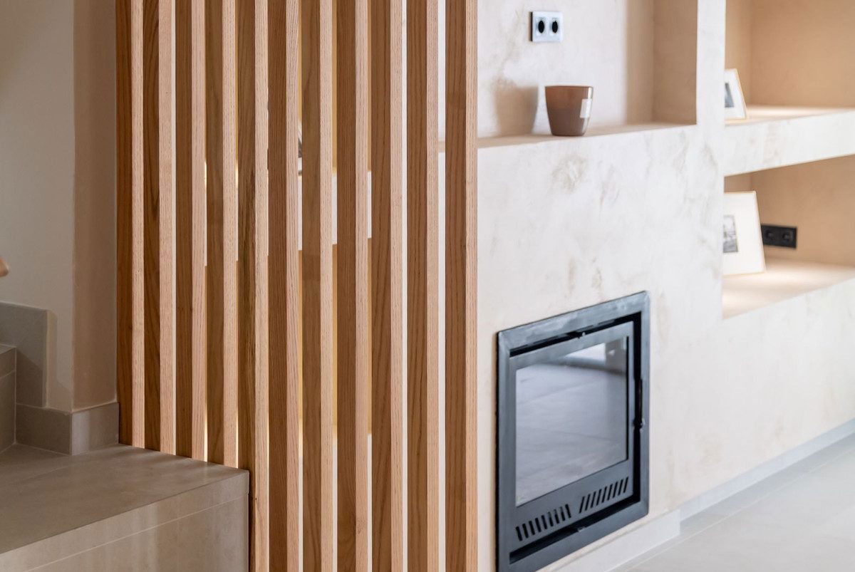 Inside, the property features a spacious open-plan layout combining the living room, dining area, and a fully fitted modern kitchen equipped with high-end integrated appliances and a wine cooler. A cosy fireplace anchors the living space, making it ideal for both entertaining and relaxing.