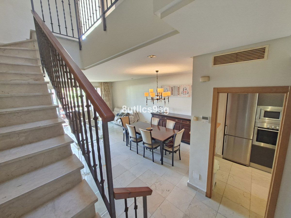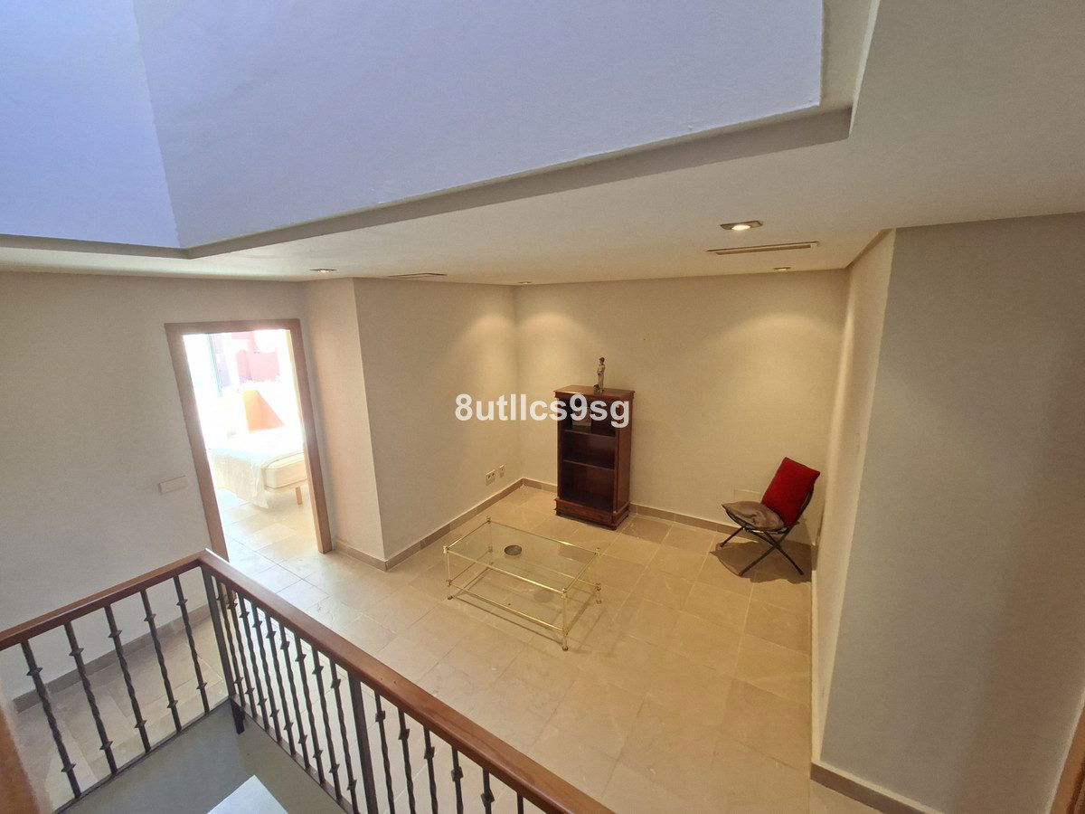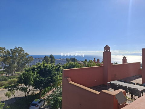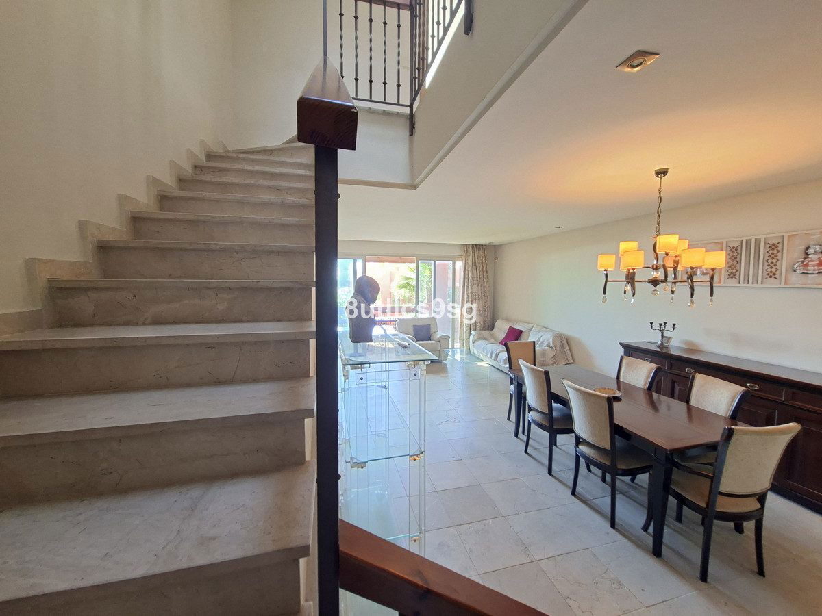 Townhouse in Bahia de Las Rocas, two minutes from Sotogrande, with two bedrooms with two en suite bathrooms (one with Jacuzzi) and a guest toilet. Spacious living room with access to the terrace overlooking the sea, Gibraltar and African coast. This townhouse has three floors and a basement that can be converted into a bedroom, game room, etc. ground floor with living room, fully equipped kitchen and guest bathroom, first floor with two bedrooms and access to a large solarium with stunning views. The property has fitted wardrobes, hot / cold air conditioning and carport. The urbanization is gated and has beautiful gardens and pools for adults and children.