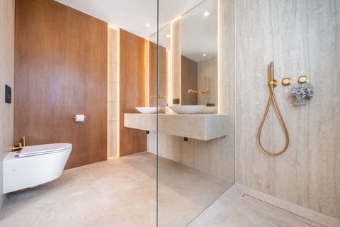 As you step upstairs into the property, you are met with a large landing comprised of the beautiful oak herringbone with bespoke bannister, to the left you will find the guest bedroom which is a very well proportioned room with custom backlit glass wardrobes featuring a linen interior to match the bedroom wallpaper. This bedroom has its own ensuite bathroom that features floor to ceiling travertine tiling, backlit niches with floating glass shelving, underfloor heating and a matching vanity unity with a full height bespoke backlit mirror.