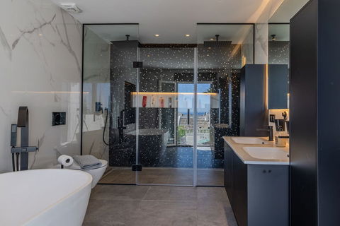 The open-plan living flows effortlessly onto a large south-facing terrace, partly covered for year-round enjoyment, with sweeping sea views and sunshine from morning to evening. High-quality finishes include air conditioning and underfloor heating throughout, ensuring comfort in every season.