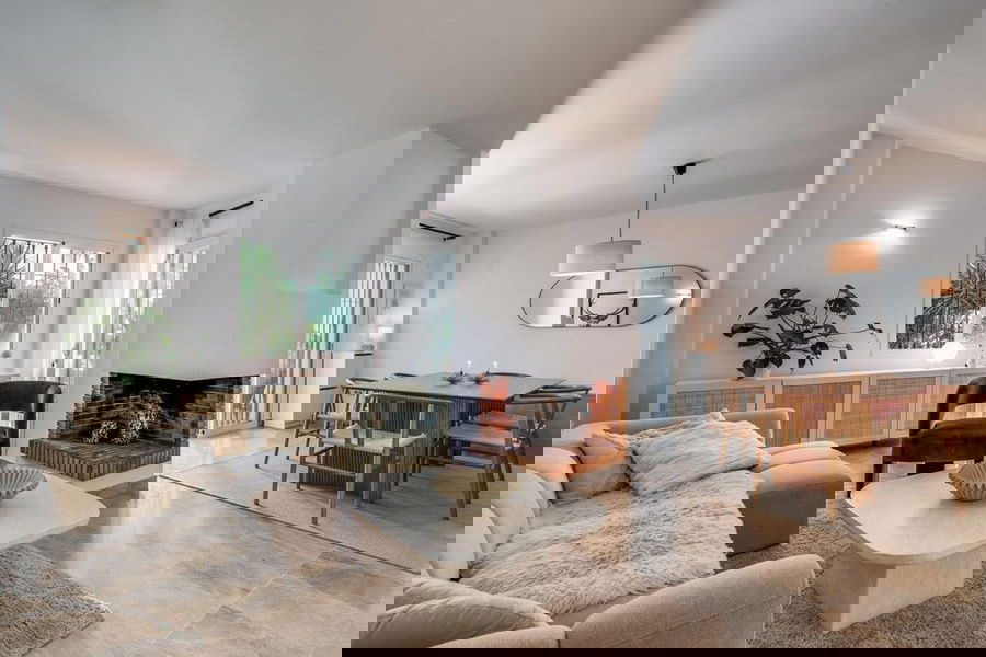On the ground floor, you will find a fully renovated open-plan kitchen, spacious and modern, seamlessly connected to the living–dining area. From here, you can access a large rear terrace, perfect for outdoor dining, as well as a guest toilet. At the front of the house, there is a peaceful patio furnished with outdoor sofas—an ideal spot to relax.