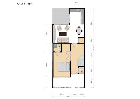 ➡️ Ground floor: Living-dining room , open-plan fully equipped kitchen , 1 bedroom with en-suite bathroom , guest toilet, and 2 patios