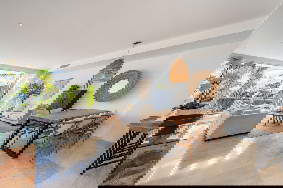 Modern townhouse with Bali-inspired interior, designed with earthy tones and natural materials to evoke a warm, tropical ambiance.
