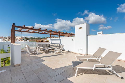 A floating staircase leads up to a 3 bedroom level with 2 bathrooms with underfloor heating. This level also offers access to a stunning solarium with pergola.