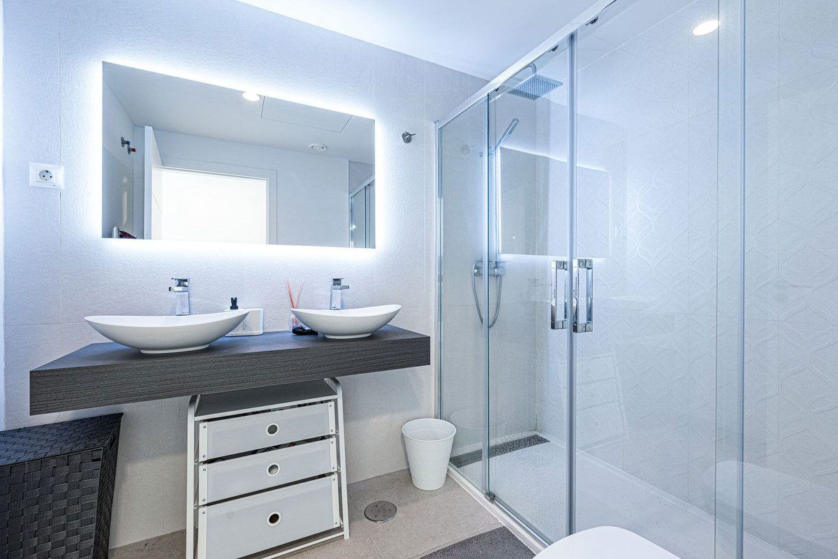 As one of the best houses on the complex, this townhouse offers a total of 4 bedrooms and 3 bathrooms. The private garage with two parking spaces leads directly into the house and the converted basement, which offers plenty of practical storage space. On the ground floor is the main entrance, the customized, open-plan designer kitchen with state-of-the-art equipment, a guest toilet and the living and dining area with wonderful views of the sea and Gibraltar. In the garden area, the south-facing orientation allows you to enjoy countless hours of sunshine on the terrace or in the private infinity pool.