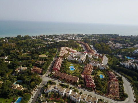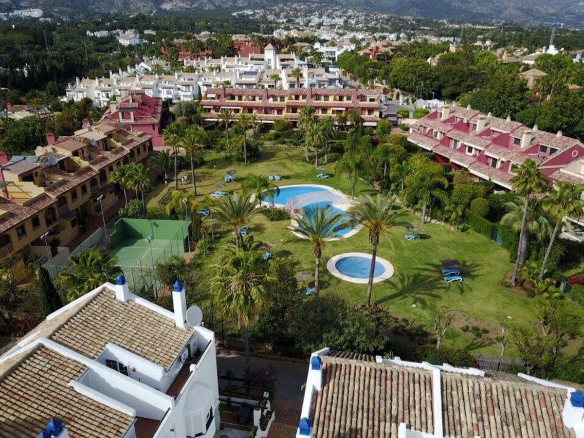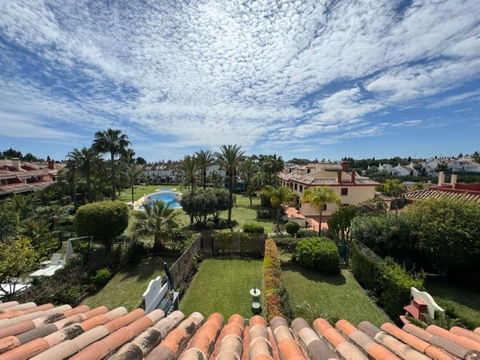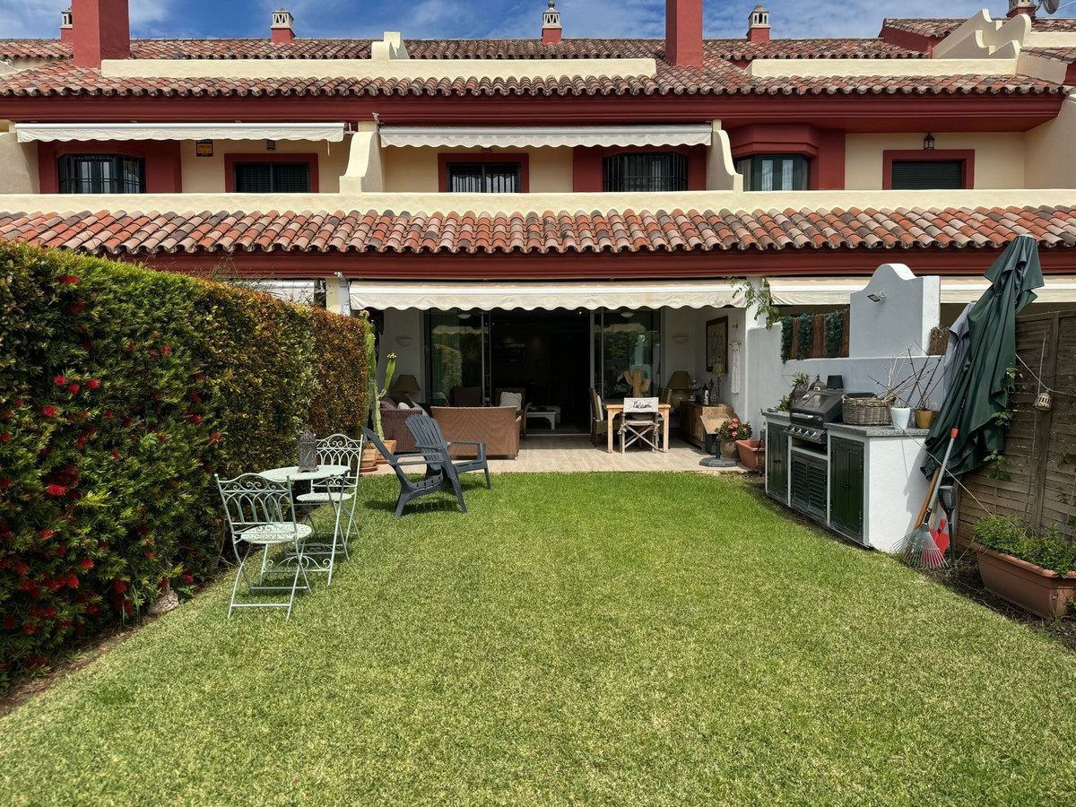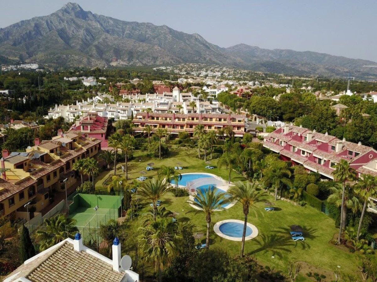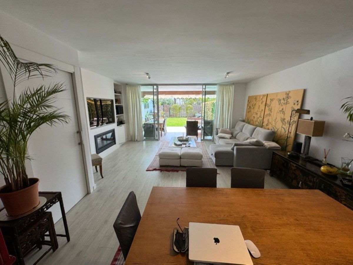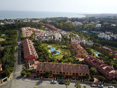 This south-facing townhouse is located in the prestigious Golden Mile area of Marbella, a stone's throw away from the luxurious Puente Romano and Marbella Club hotels, along with their exclusive beach clubs. It's also conveniently close to the heart of Marbella and the chic Puerto Banus. Set within a securely gated community that merges modern design with classic Mediterranean flair, this property is surrounded by beautiful, lush gardens featuring palm trees and offers access to two swimming pools.