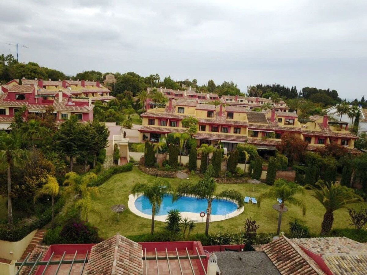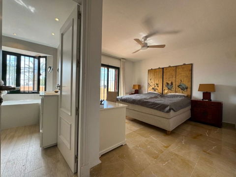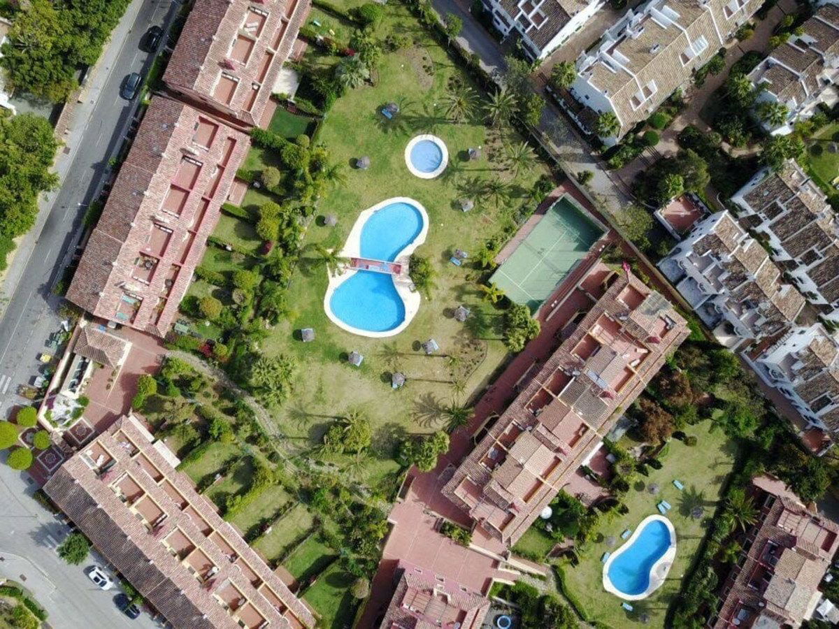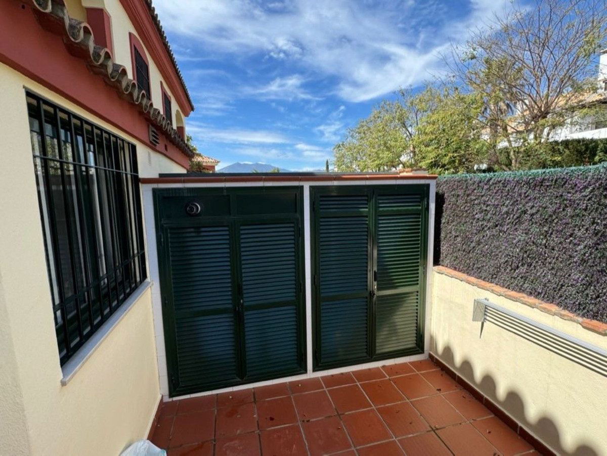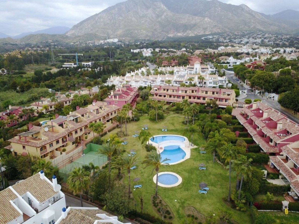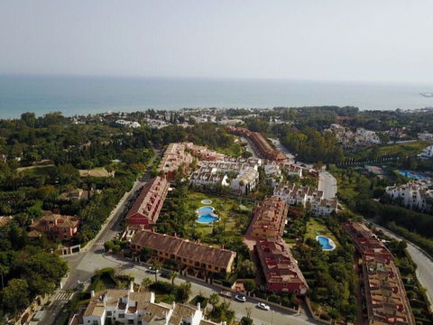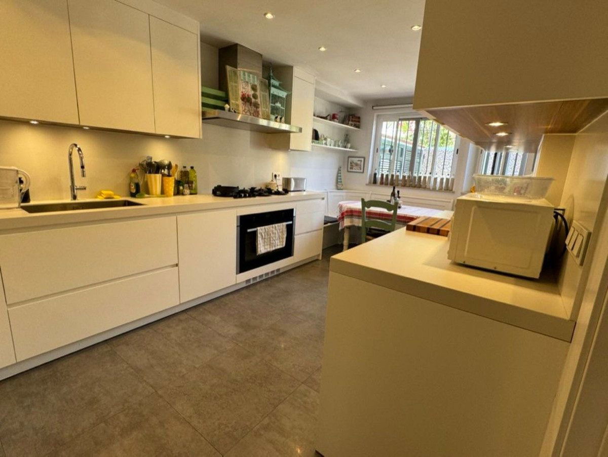 This south-facing townhouse is located in the prestigious Golden Mile area of Marbella, a stone's throw away from the luxurious Puente Romano and Marbella Club hotels, along with their exclusive beach clubs. It's also conveniently close to the heart of Marbella and the chic Puerto Banus. Set within a securely gated community that merges modern design with classic Mediterranean flair, this property is surrounded by beautiful, lush gardens featuring palm trees and offers access to two swimming pools.